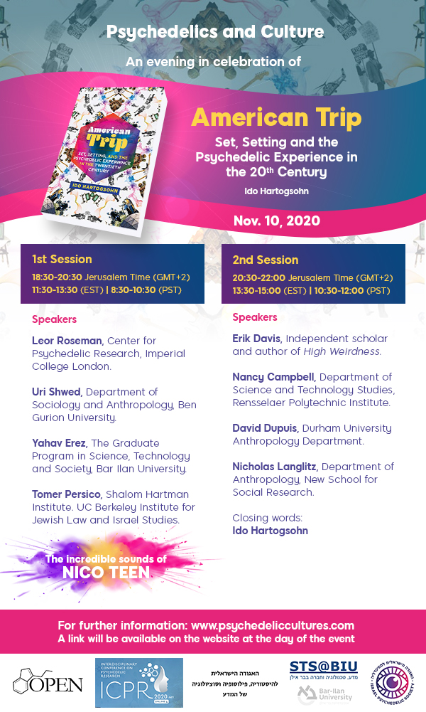 Psychedelics and Culture is an evening in celebration of the publication of American Trip: Set and Setting and the Psychedelic Experience in the Twentieth Century by Ido Hartogsohn. Eight leading scholars who study psychedelics from diverse perspectives (sociology, anthropology, neuroscience, STS, religious studies) will speak to the cultural dimensions of psychedelia and offer commentary on the themes, ideas and questions presented in American Trip. Israeli indie group Nico Teen will provide psychedelic sounds, and The Psychedelic Video Museum will add some indispensable kaleidoscopic colors.